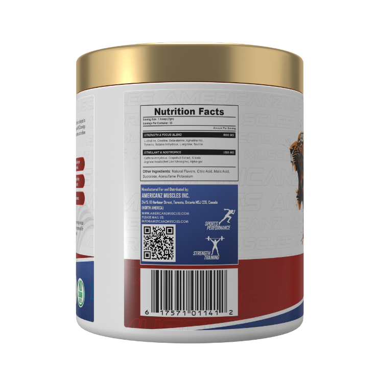 AMERICANZ MUSCLES FRENZY PRE-WORKOUT Unleash your inner beast with Americanz Muscles Frenzy Pre-Workout. This potent formula is designed to fuel your most intense workouts, providing a powerful boost of energy, focus, and endurance. With 35 servings per container, Frenzy Pre-Workout helps you power through tough sessions, push past plateaus, and achieve your fitness goals. Get ready to take your workouts to the next level!